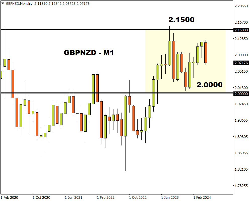 Our attention falls on the GBPNZD which has been trapped within a 1500-pip monthly range since August 2023.