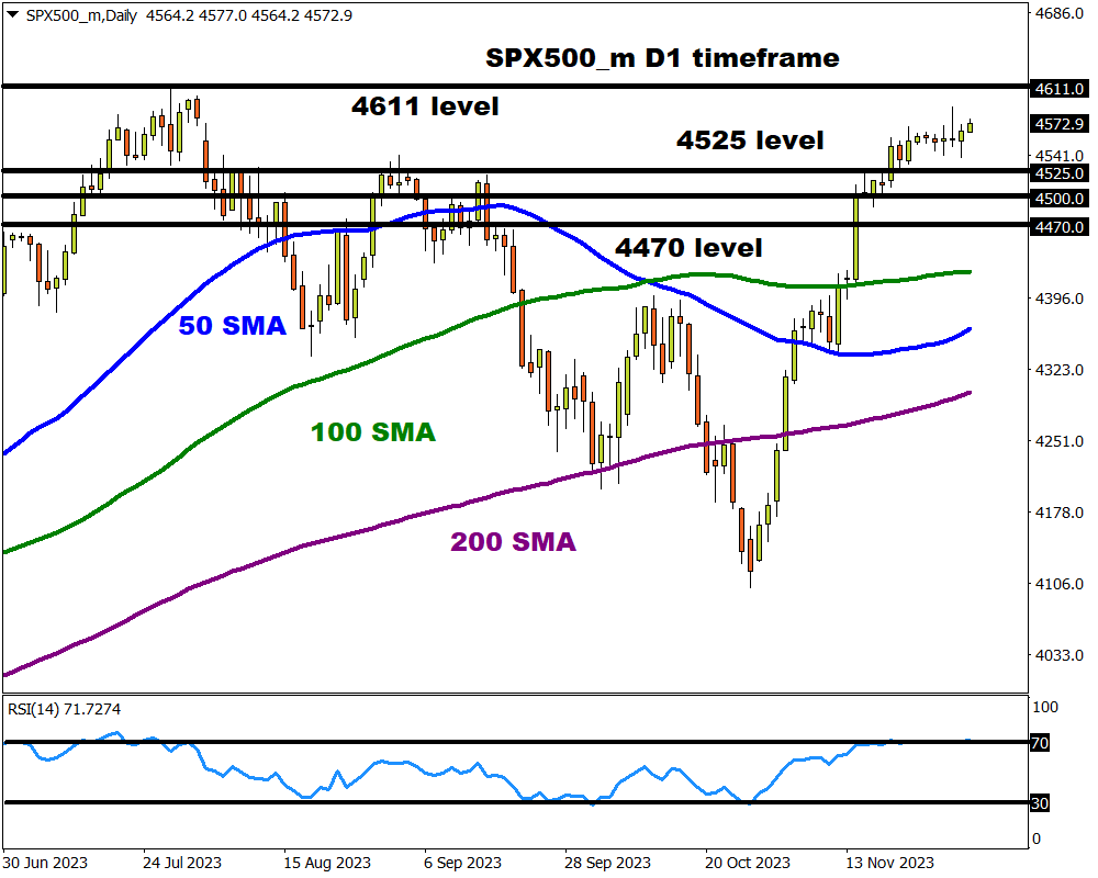 - The support at 4525 could provide bulls the foundation to attack the 2023 high at 4611 and 4660 – a level not seen since January 2022.