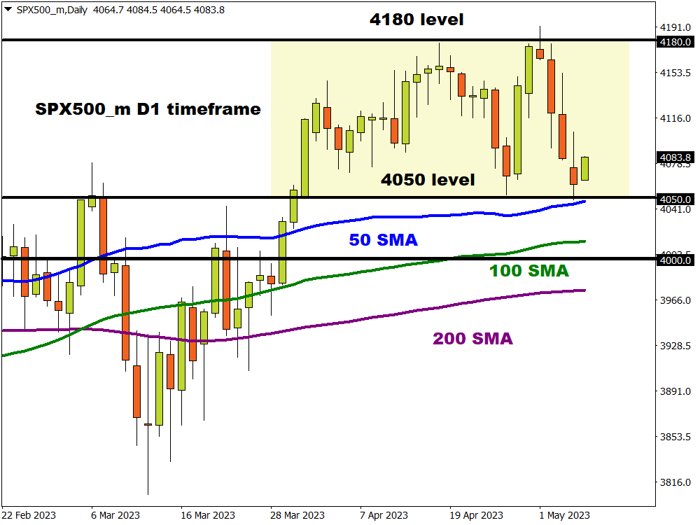 - If the inflation numbers beat expectations, this may trigger a bearish breakout on the SPX500_m – taking prices below the 4050-support level.