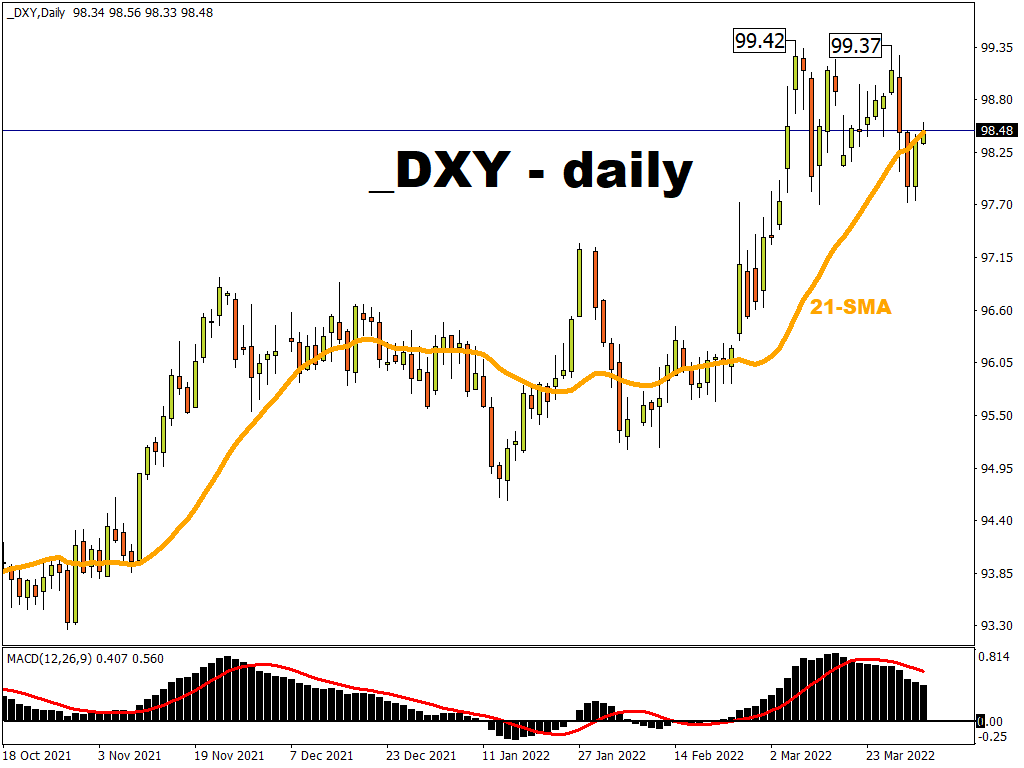 Despite faltering in recent sessions, the DXY is attempting to climb back above its 21-day simple moving average, striving to retain the 99.0 handle once more.