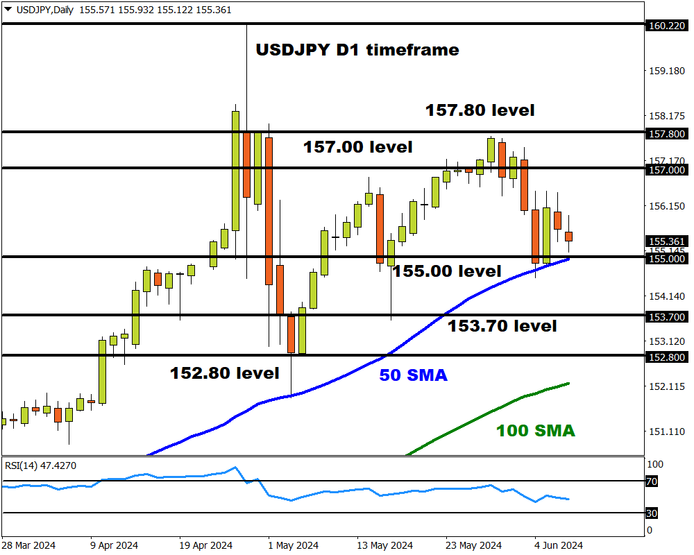 The USDJPY is under pressure on the daily charts with prices approaching the 155.00 support level. However, prices are trading above the 50, 100 and 200-day SMA.