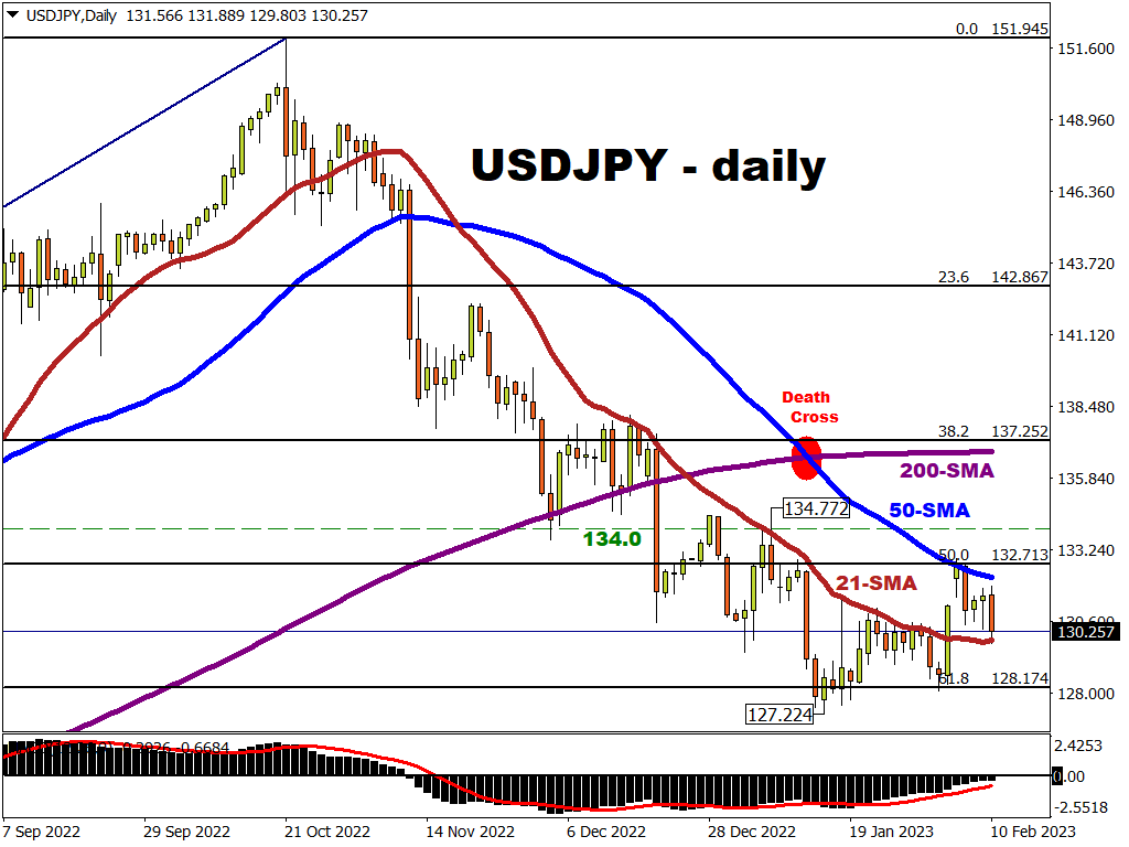 - 50-day simple moving average (SMA) = which has been thwarting USDJPY’s recent attempts to move higher