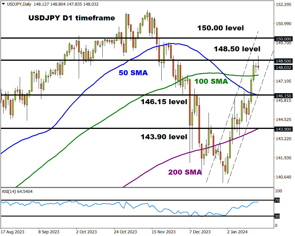 The USDJPY is respecting an ascending channel on the daily timeframe with prices trading above the 50, 100 and 200-day SMA. However, the Relative Strength Index (RSI) is approaching 70, indicating that prices are overbought. In addition, key resistance levels can be found at 148.50 and the psychological 150.00 level.