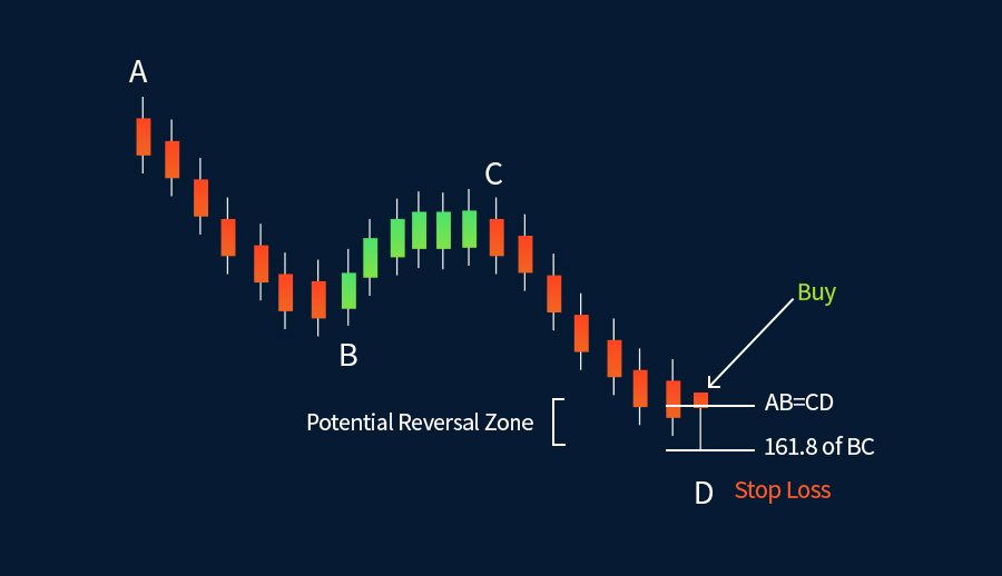 一旦形態確立,就可觸發交易,無論是買進還是賣出。在下面的圖表中,形態完成於D點,其中AB=CD。此外,BC的161.8延伸位和D共同確定了潛在的反轉區。在本例中,終端價格線錘子線測試了D點和BC的161.8延伸位。在該形態結束時出現的錘子線,預示著看跌走勢的結束,新的上升走勢的開始。這是您的買入機會。