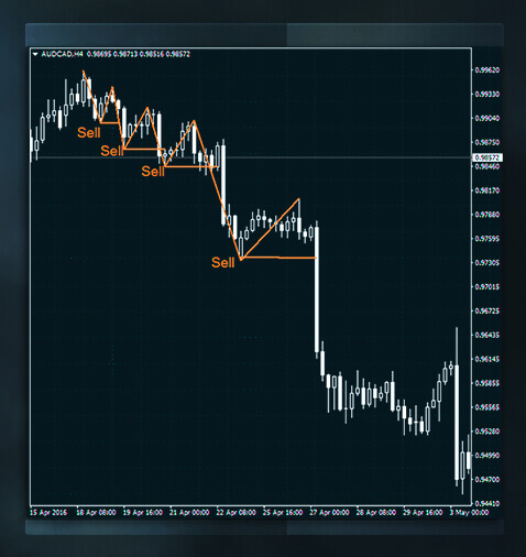 連續的更低的頂部(或波峰)和更低的底部(或波谷)形成的形態為下行趨勢。在這種趨勢中,供應超過需求,支撐位不能承受住拋盤壓力。這樣,價格跌破支撐位,在圖表上錄得更低的低點。