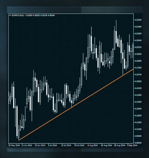 上升趨勢線在價格上行走勢中構成支撐;即價格觸及這條線就反彈。在此支撐下,買盤動力超過賣盤,價格被推高。