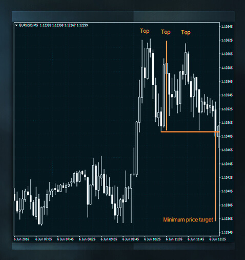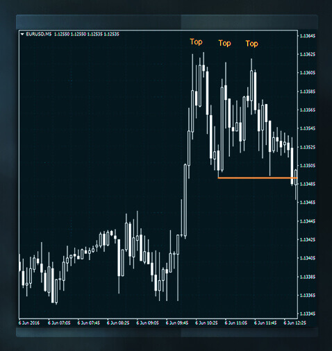 什麼是三重頂?與頭肩形態類似,三重頂形態由三個(幾乎)等高的頂部和收盤大幅跌破支撐位(底部)構成。價格跌破形態底部,才能構成有效三重頂形態,光有三個頂部是不夠的!