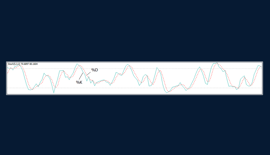第二條線,%D,通過平滑%K來估算。簡而言之,它是%K的3個周期簡單移動平均線: