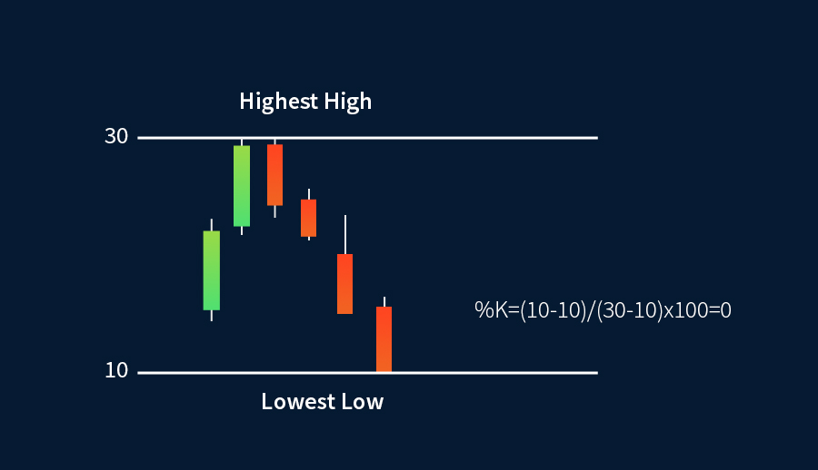 假設周期為5,最高的高點為30,最低的低點為10,當前收盤價為20,可以用上面的公式計算%K線: