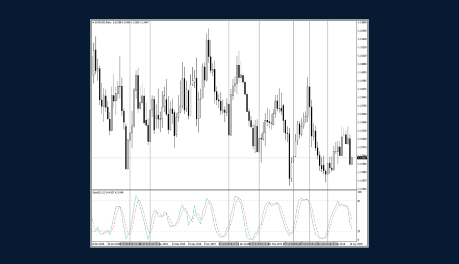 隨機震蕩指標是常用的技術分析工具,幾乎所有的交易平台都有這個技術指標,世界各地的交易員廣泛使用該指標。它是由著名的技術分析師George Lane開發的,他的假設是在上升走勢中收盤價趨於接近K線的高端,而在下跌走勢中收盤價趨向於接近K線的低端。同樣地隨機震蕩技術指標決定了在選定的時間段內收盤價格相對於特定價格區間的位置。在上升趨勢中,收盤價趨於接近價格區間的頂部,而在下降趨勢中,價格接近底部。隨機震蕩指標由兩條線組成:%K和%D。主要的信號使用%D產生。