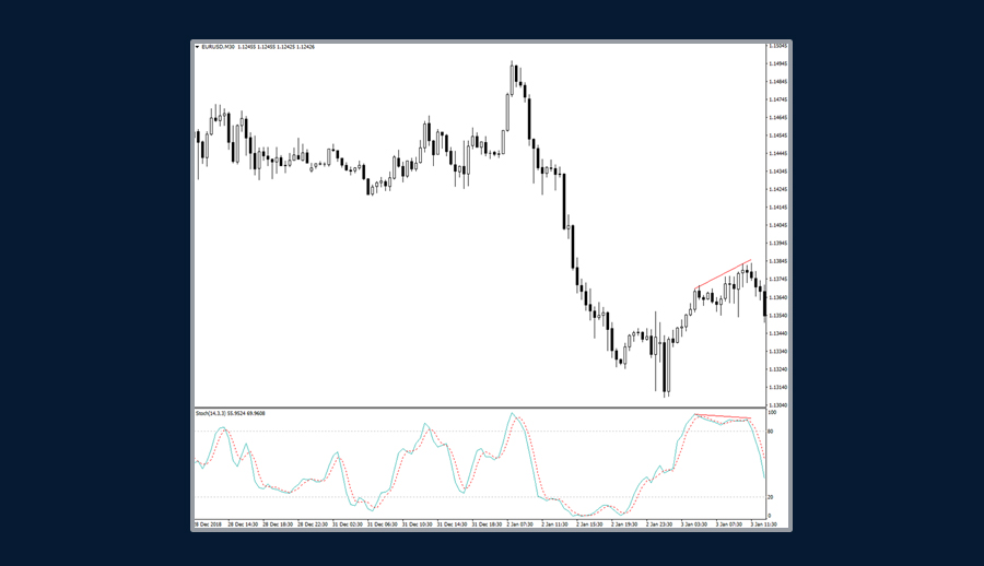 隨機震蕩指標除了在0到100之間的振蕩以及穿越快線(%K)和慢線(%D)可產生信號外,背離也可用於釋放信號。