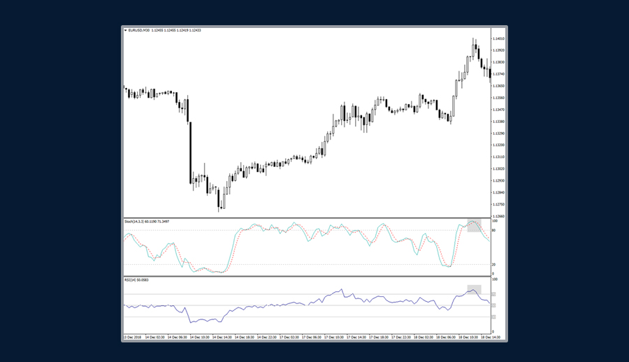 例如,如果RSI位於70以上的超買區,%K和%D上穿80,那麼預示價格圖表上可能即將出現轉折點。