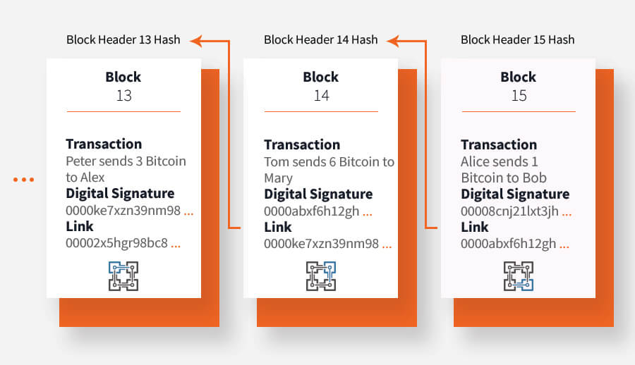 وكما هو موضح في المثال أعلاه (والذي جرى تبسيطه بحيث يحتوي على معاملة واحدة في الكتلة)، إذا أرادت أليس إرسال 1 بيتكوين إلى بوب، يتم إنشاء كتلة جديدة لتسجيل المعلومات ذات الصلة . سيتم تعيين رقم كتلة (في هذه الحالة هو 15) للمعاملة نفسها، وكذلك رابط للكتلة السابقة (0000abxf6h12gh) وتوقيعًا رقميًا (00008cnj21lxt3jh) والذي يكون فريدًا للمحتوى الكامل للكتلة.