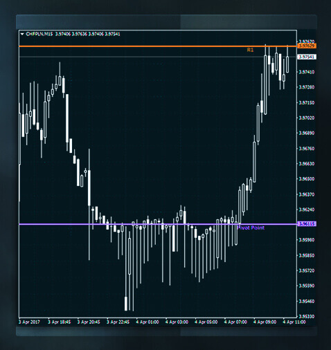 وعندما تكون الأسعار منحصرة بين النقطة المحورية ومستوى الدعم رقم 1، وهذه المنطقة المنحصرة تعرف أيضًا باسم النطاق، من المحتمل أن تظهر فرص تداول للمشترين عندما ترتد الأسعار صاعدة من مستوى الدعم رقم 1، وفرص تداول للبائعين عندما ترتد الأسعار منخفضة من النقطة المحورية.