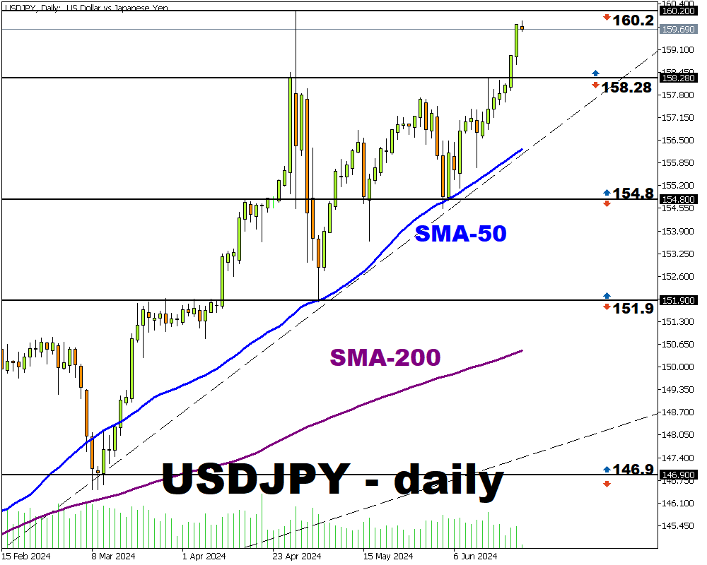 En este escenario las alertas de intervención hacia el yen continúan creciendo, especialmente que la paridad USDJPY se acerca al nivel de 160, que fue en el valor donde anteriormente intervino el Banco central de Japón (BoJ).