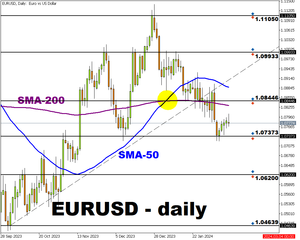 En el caso de comenzar una recuperación, la primera resistencia que el EURUSD buscará superar es 1.084466, nivel difícil de superar por la confluencia de la media de 200 más la línea alcista.