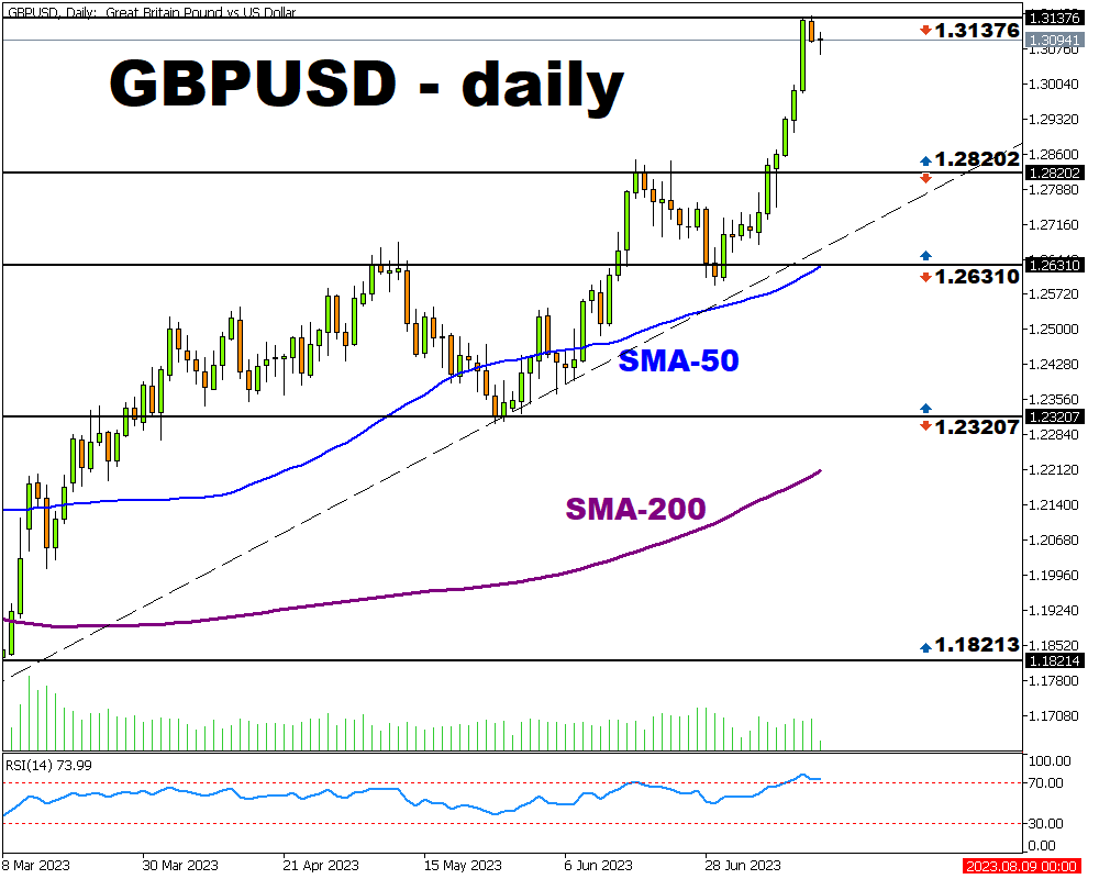 Este fuerte impulso alcista lo hizo alcanzar 1.31376 quedando en estado de sobrecompra en el corto plazo como lo muestra el RSI (73.8). Esto indicaría que el par puede corregir para volver a ingresar al rango de oscilación normal entre 70 y 30.-