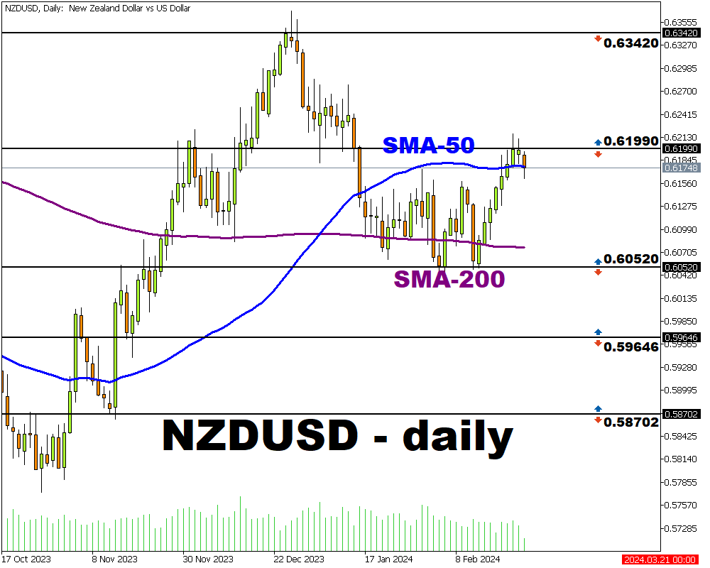Además, la media móvil de 50 días también aparece como un nivel técnico importante a superar para continuar escalando. Entonces, si el NZDUSD no es capaz de superar 0.61990: