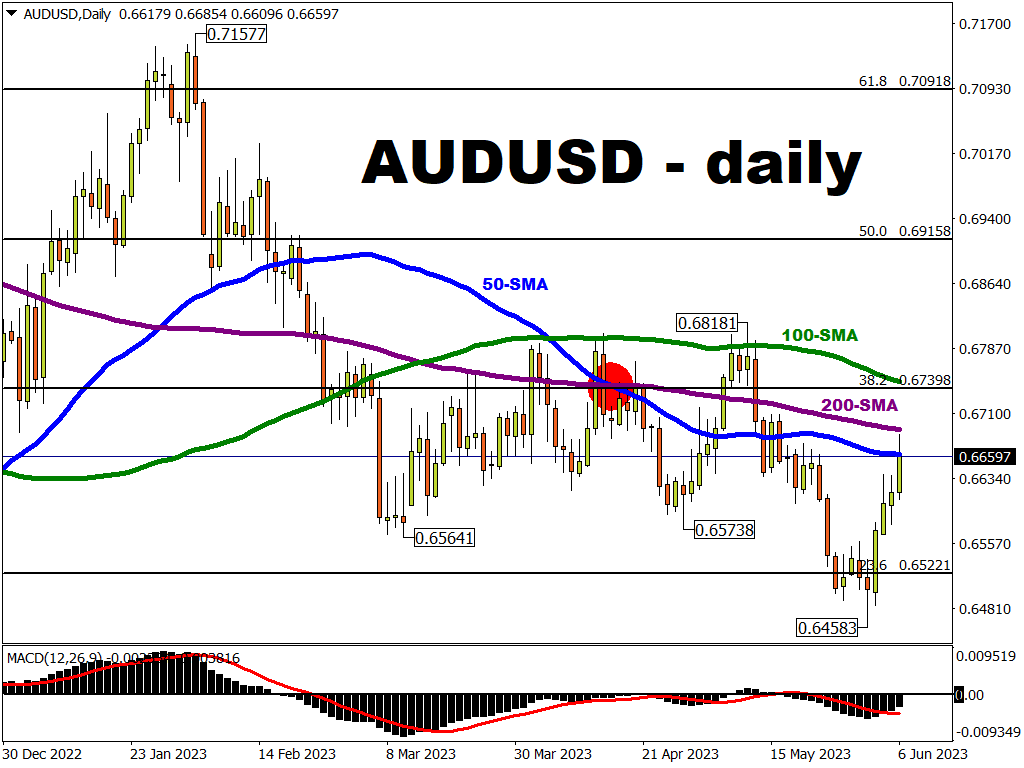 After falling to a low below 0.65 and last seen in November 2022, the major is heading towards its 200-day simple moving average (SMA) at 0.6692.
