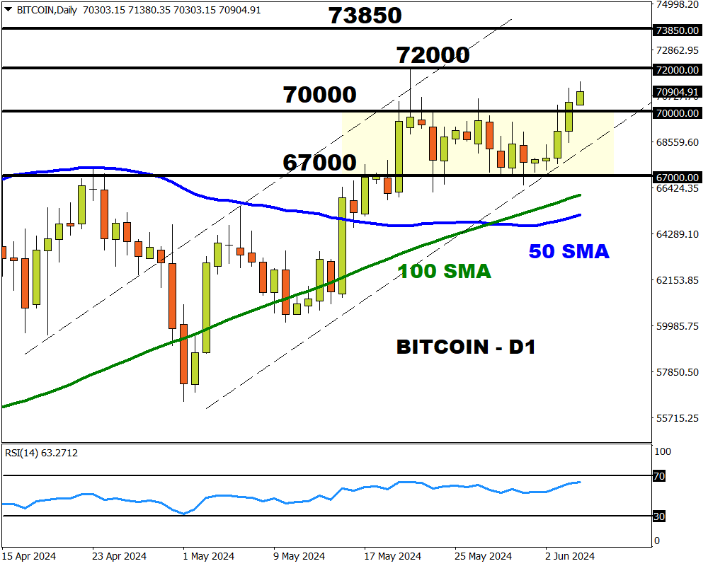 Prices have turned bullish on the daily charts after the breakout above $70,000. The upside momentum may take the crypto towards the $72,000 resistance level in the short term.