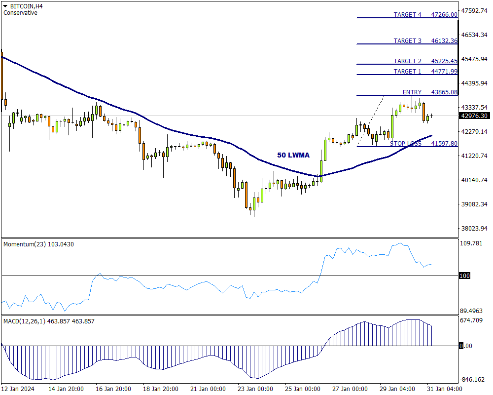 Bitcoin kicked of the week charging through a significant resistance level at 42053.06, signalling the start of a potential uptrend on the daily timeframe.