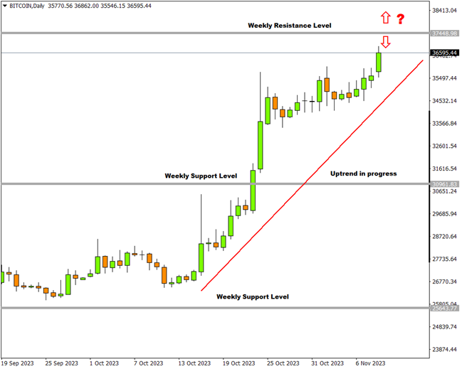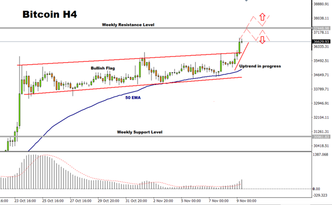 Prices are fast approaching weekly resistance at 37,448 and this level might act as a catalyst for either bulls or bears. For bulls, it will be a continuation of the current impulse wave and for bears it will be the start of a possible correction wave.