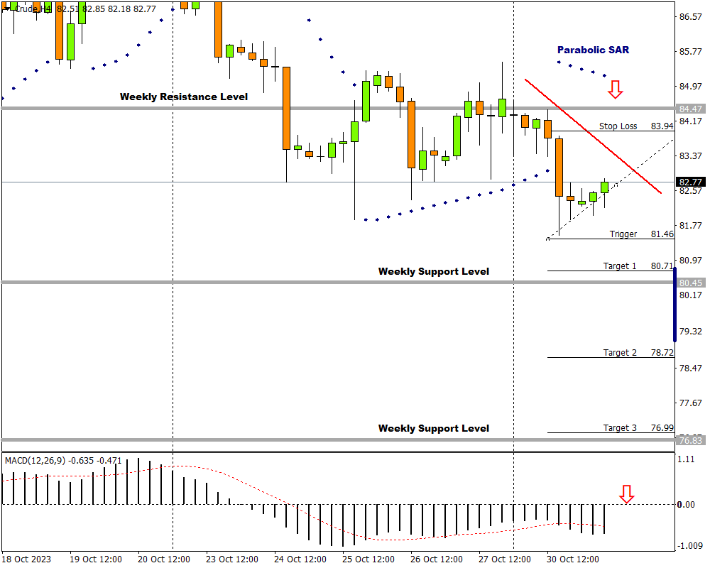 The first possible target is at 80.71 (Target 1), just before a weekly support level. This target will help with risk management.