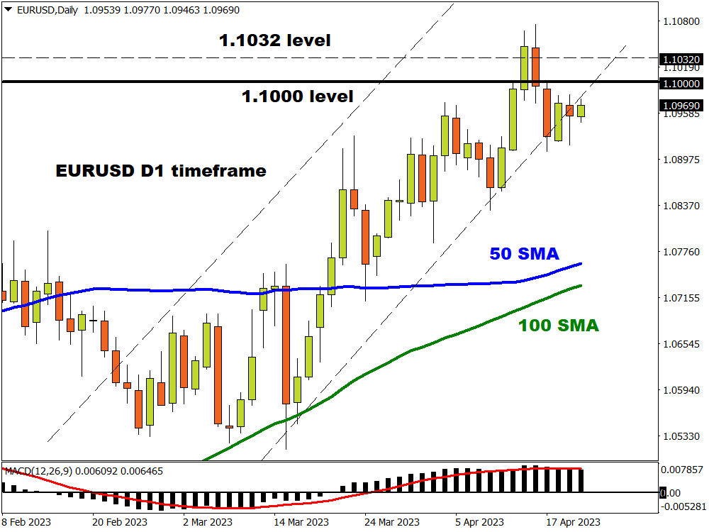 We get more ECB speakers on the wires today though it appears that the bar for a hawkish surprise is now high ahead of that huge week of central bank meetings in early May. Similar to GBP, the rise in rate hike bets hasn’t pushed EUR/USD to its recent highs, above 1.10. But dips have been supported and prices remain in an ascending channel with a series of higher highs and higher lows since early March. A weekly close above 1.1032 is important to sustain the bull trend.