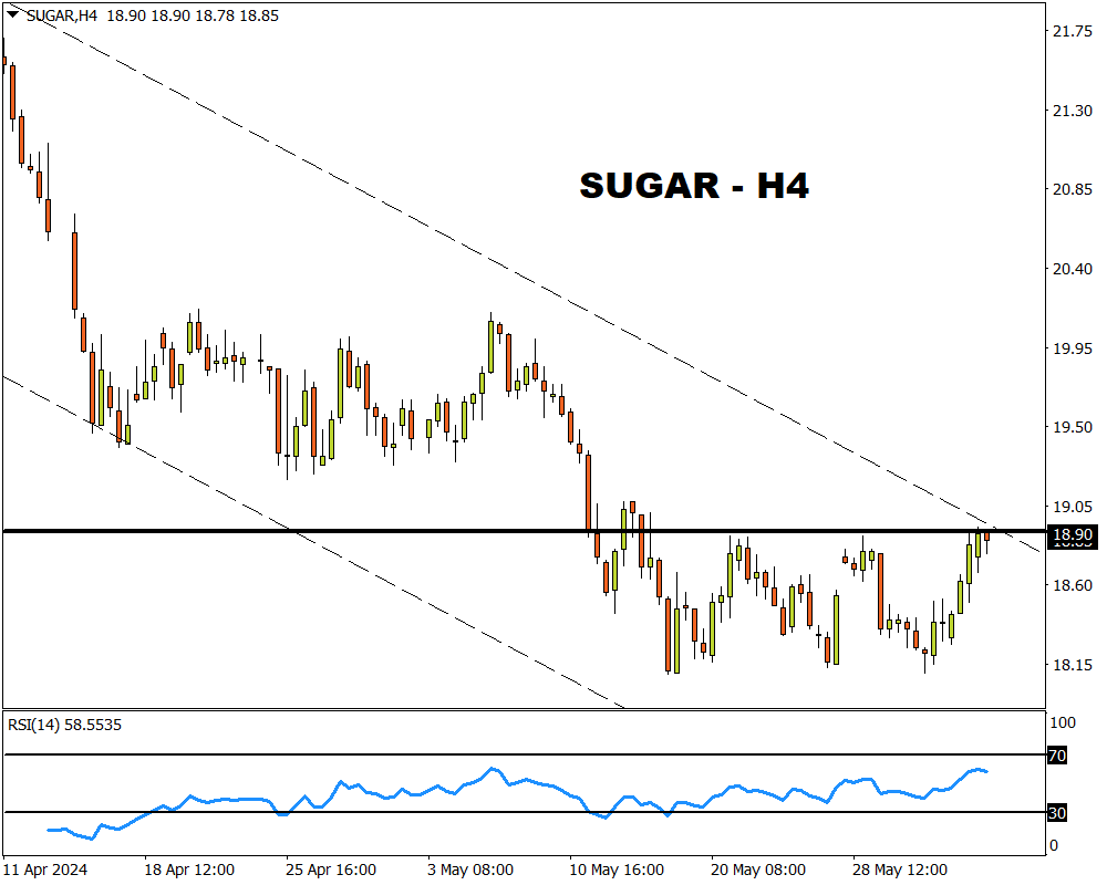 Sugar is trending higher on the H1 timeframe with prices above the 50, 100, and 200 SMA. However, the Relative Strength Index (RSI) has crossed above 70 – indicating that prices are overbought.