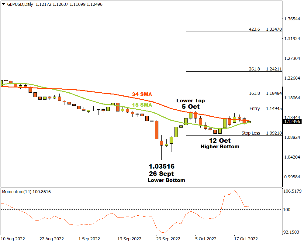 A possible critical resistance level formed on 5 October at 1.14945. The bears then thought they could take control of the market again but this was not to happen as a higher bottom formed on 12 October at 1.09218 as the bulls resumed their momentum buildup.