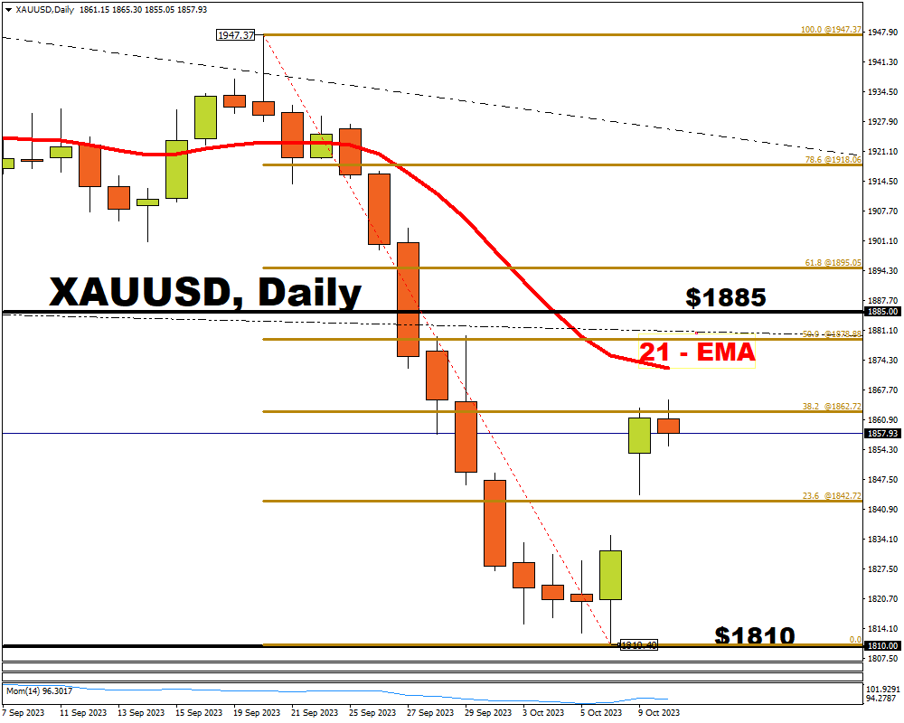 Applying the Fibonacci retracement tool on the daily timeframe, from September 20th’s high at $1947.37 to October 6th’s low at $1810.40 we see the 38.2 retracement level at $1862.82 acting as the current resistance zone.