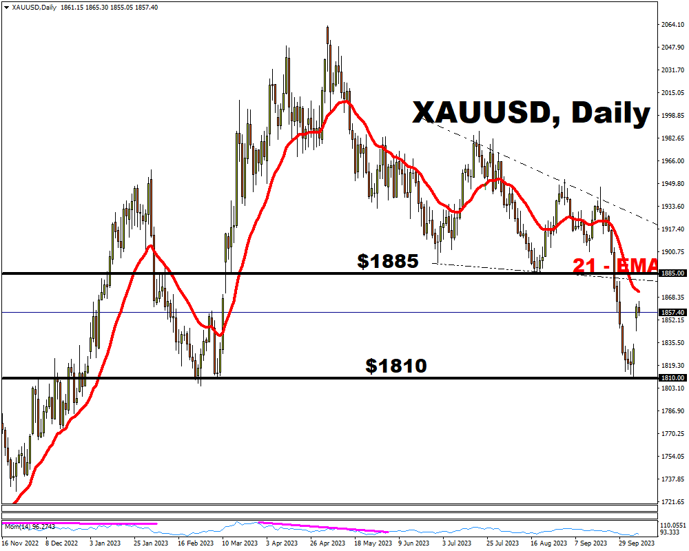 Friday’s post-NFP price action saw gold bounce off levels not seen since March 2023 at $1810, to post its first bullish candlestick since September 19th.
