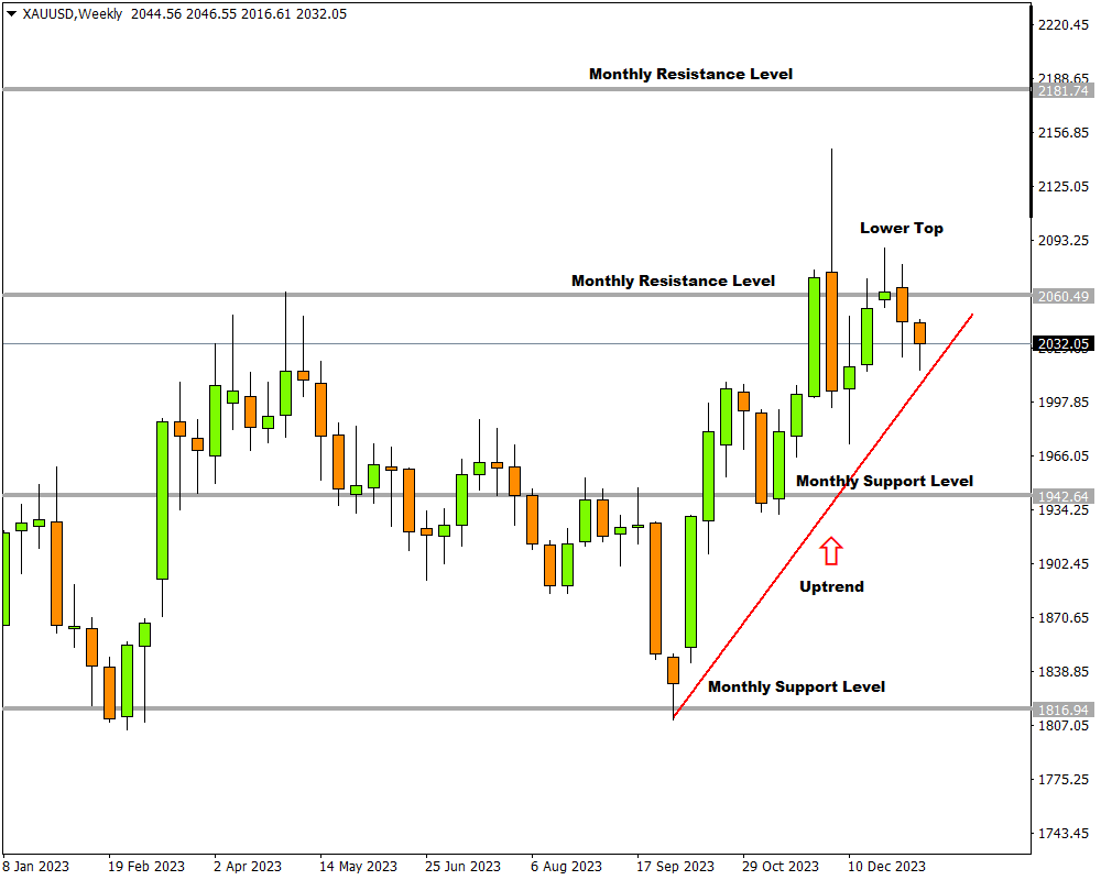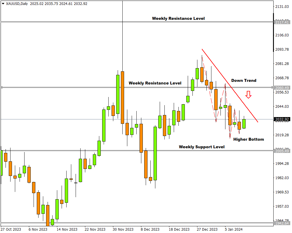 The precious metal is busy with a correction wave in an uptrend on the weekly timeframe which could act as a possible area of trendline support. Looking at the daily charts, a downtrend is advancing but the price is getting closer to a weekly support level and a higher bottom might already be in progress.