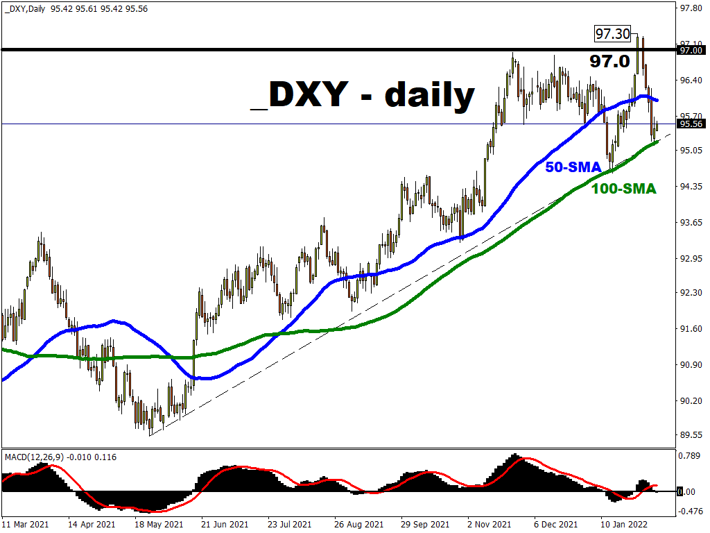 The dollar index fell sharply last week from 18-month highs as the ECB moved away from its ultra-accommodative policy stance. Fed officials had also recently calmed fears that a 50-point rate hike was on the cards at its next meeting in March, though the odds for this more than doubled on Friday to around 36% after the solid labour market data. This will add to the ammunition for the Fed hawks, with the fall in Omicron infections meaning there are hopes of a substantial rebound in activity from the second quarter.