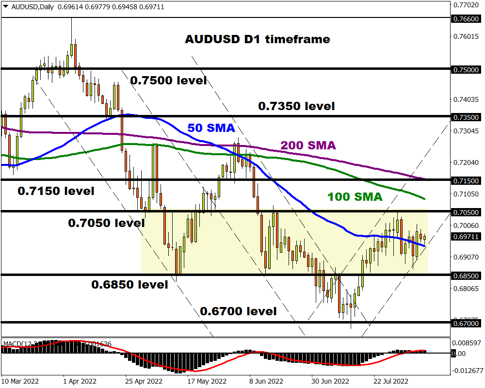 Since punching back above 0.6850 back in mid-July, the AUDUSD has been trapped within a range. Support can be found at 0.6850 and resistance at 0.7050. Given how prices are trading above the 50-day SMA and the MACD is above zero, bulls have a platform to push prices higher. However, the currency pair could be waiting for a fundamental catalyst to experience a breakout/down.