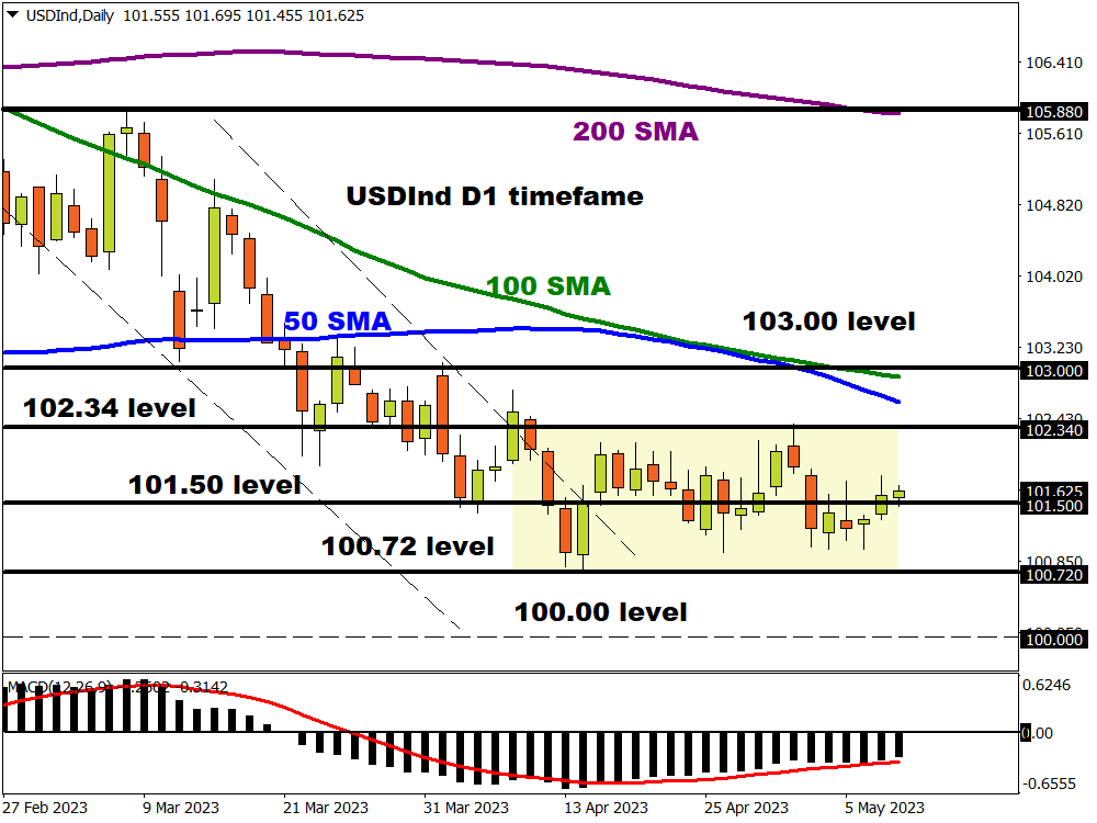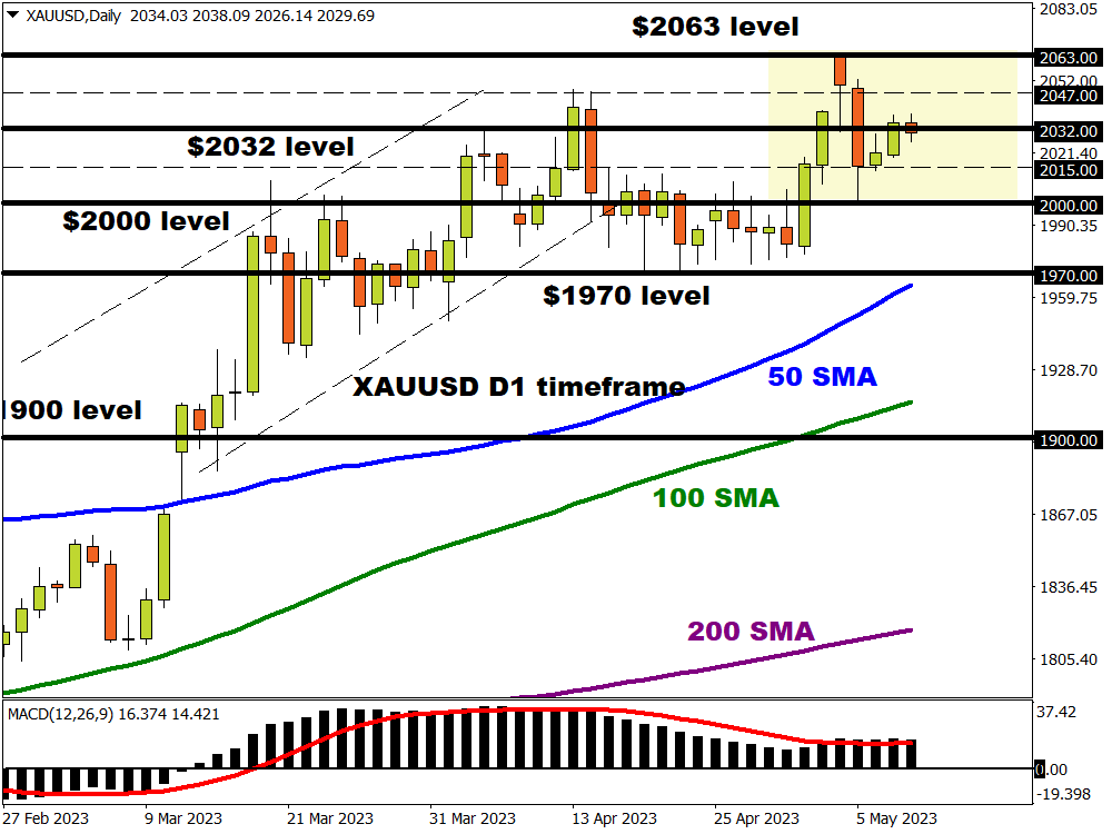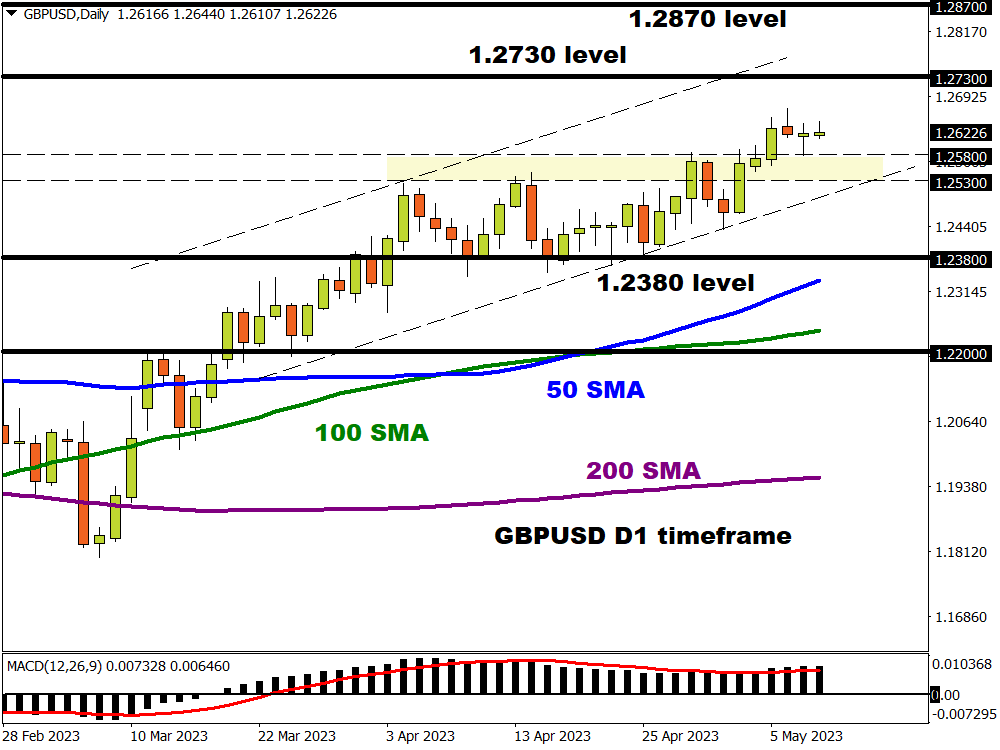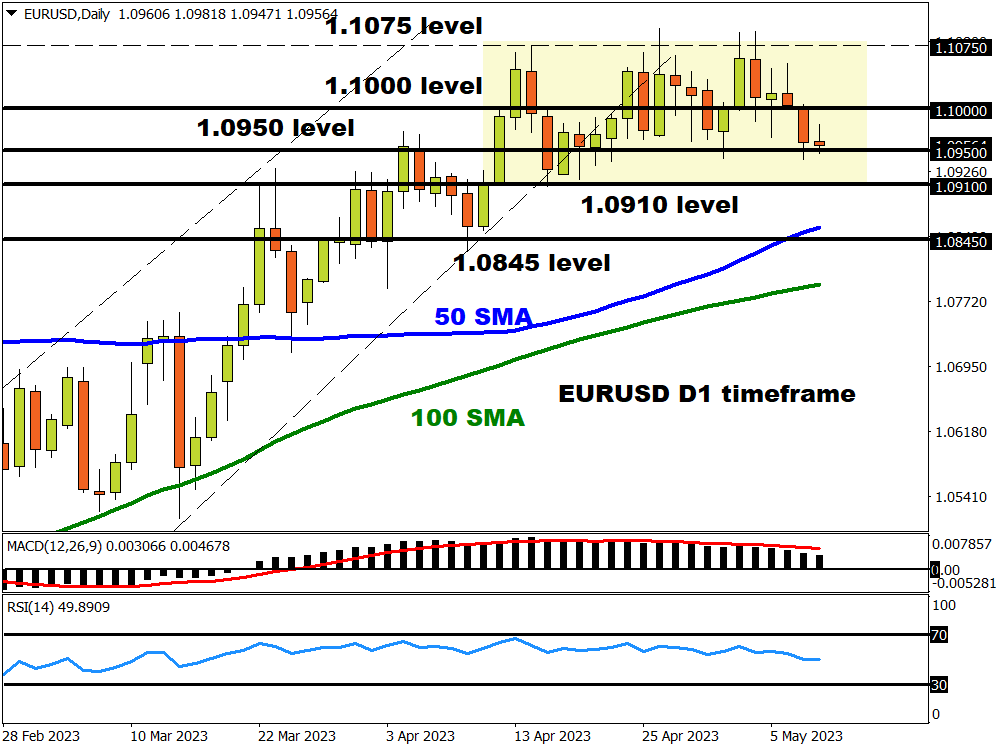 It is the same old story for the EURUSD with prices trapped within a range. Support can be found around 1.0912 and resistance at 1.1075. Bears seem to be making a move, dragging prices closer toward the support. However, the pending US inflation report could heavily influence the currency pair's short-term outlook. A bearish breakout under 1.0912 could open the doors toward 1.0845 – where the 50-day SMA resides.