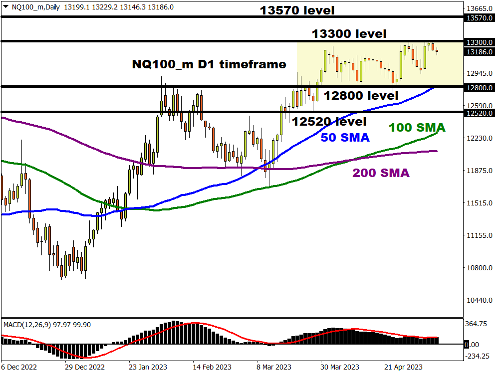 It feels like most markets are on standby, waiting for the next big catalyst to trigger a big move. The NQ100_m remains in a range with support found at 12800 and resistance at 13300. A breakout could be on the horizon.
