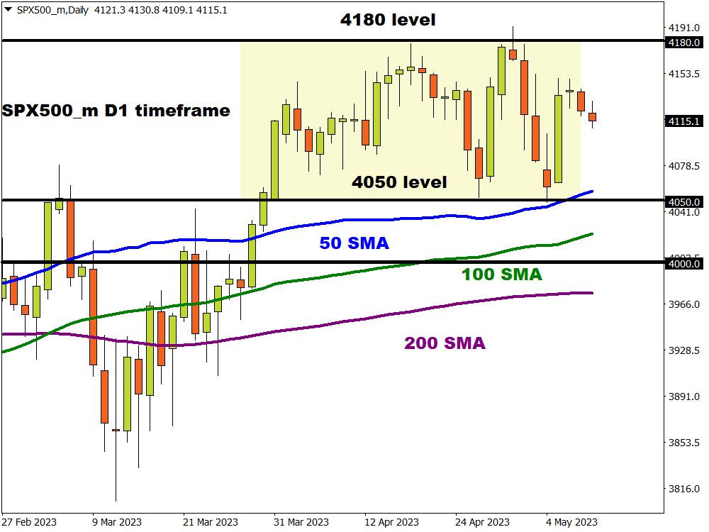 The SPX500_m needs a potent fundamental spark to trigger a bullish or bearish breakout. Support can be found at 4050 and resistance at 4180. A break below 4050 may open the doors towards 4000. If bulls push prices beyond 4180, the index may target levels not seen since August 2022 around 4280.