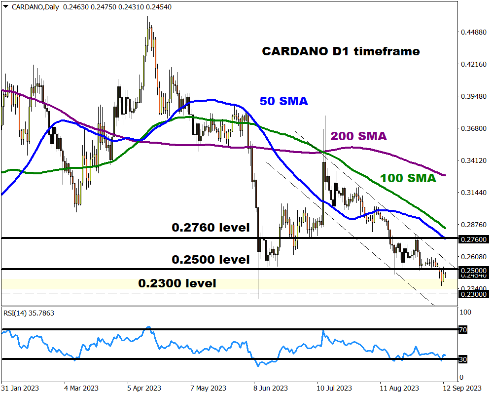 Cardano prices are trading near their lowest levels in 2023, falling below $0.25 as bears switch into higher gear. Funny enough, the cryptocurrency is back to where it started the year with technical indicators showing mixed signals. Although prices are respecting a bearish channel and remain well below the 50,100 and 200-day SMA, the RSI recently dipped below 30, indicating that it may be oversold.