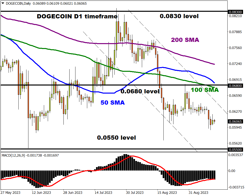 The past few days have been choppy for Dogecoin with prices slowly approaching key support at 0.0550. Even though the cryptocurrency is respecting a bearish channel, there seems to be some indecision on the daily charts.