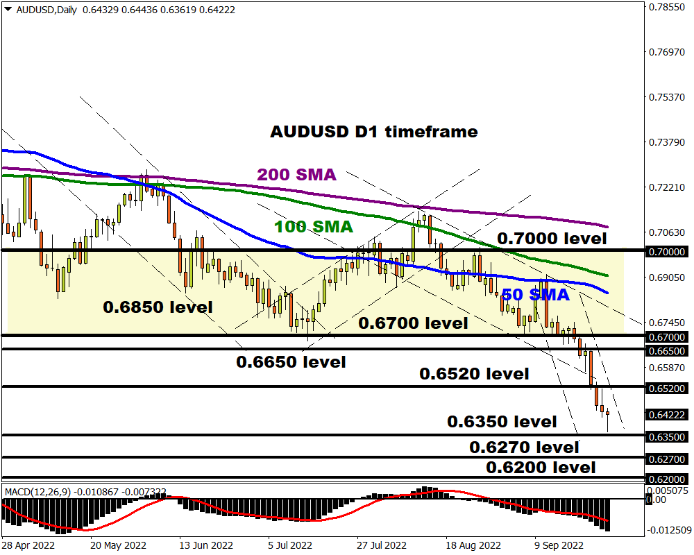 Aussie bears remain in the driving seat as the currency pair descends lower with each passing day. There have been consistently lower lows and lower highs while the MACD trades to the downside. A strong breakdown below 0.6350 could encourage a decline towards 0.6270 and 0.6200.