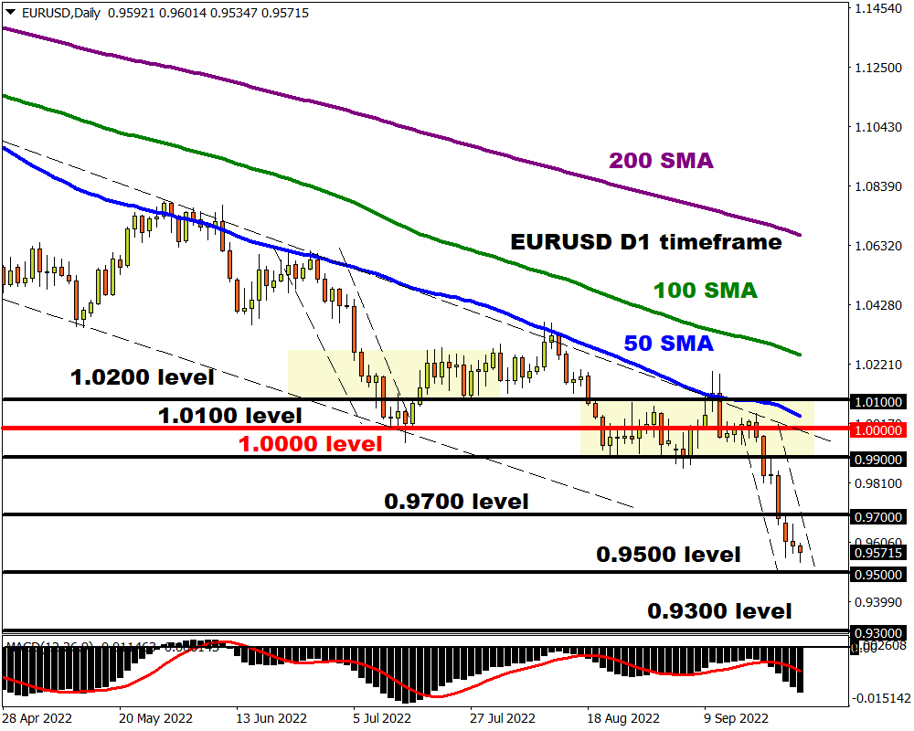 An appreciating dollar has dragged the EURUSD well below parity. Prices are heavily bearish on the daily timeframe with the candlesticks respecting a bearish channel. A strong breakdown below 0.9500 could open a path towards 0.9300. If 0.9500 proves to be tough support to crack, a rebound back towards 0.9900 and parity could become reality.