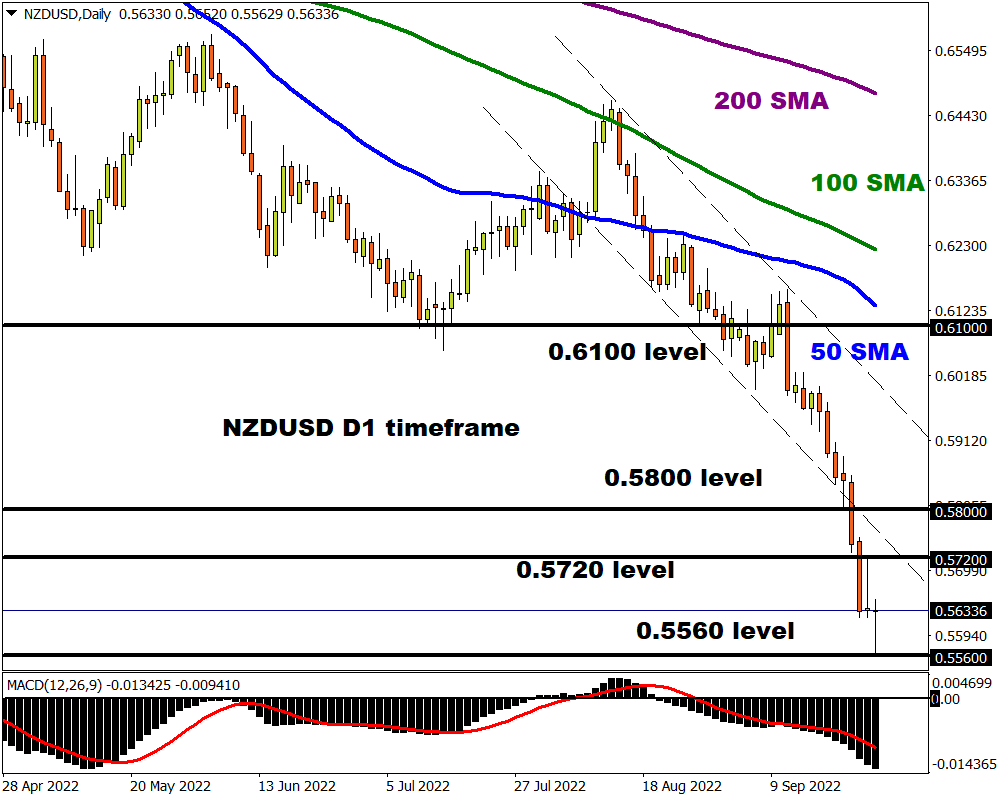 After dropping over 500 pips this month, could the NZDUSD be preparing for a rebound? There have been consistently lower lows and lower highs while the MACD trades to the downside. Prices recently staged a strong rebound from the 0.5560 level with bulls eyeing 0.5720 and 0.5800, respectively, below 0.55600 – prices may sink towards 0.5500.