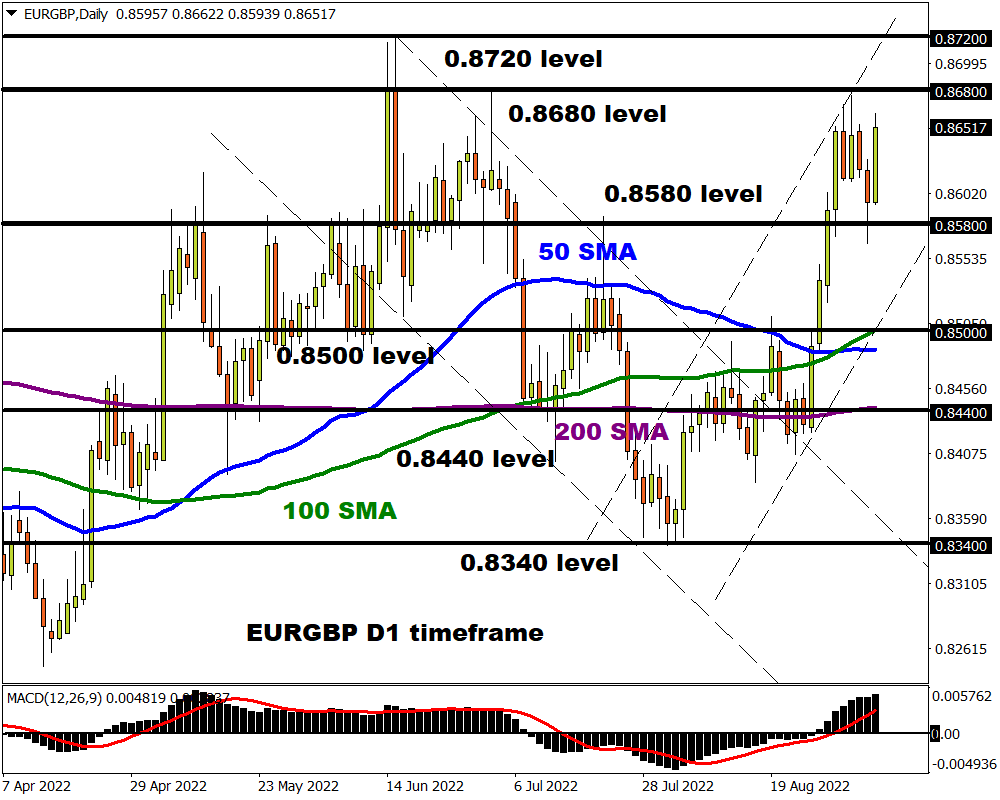 A classic breakout opportunity could be forming on the EURGBP as prices slowly approach the 0.8680 resistance level. A solid breakout and daily close above this point may encourage a move towards 0.8720 and 0.8800, respectively. Technical indicators such as the 50, 100, and 200-day SMA and MACD favour further upside. If the EURGBP dips back toward 0.8580, then the next key level of interest can be found at 0.8500.