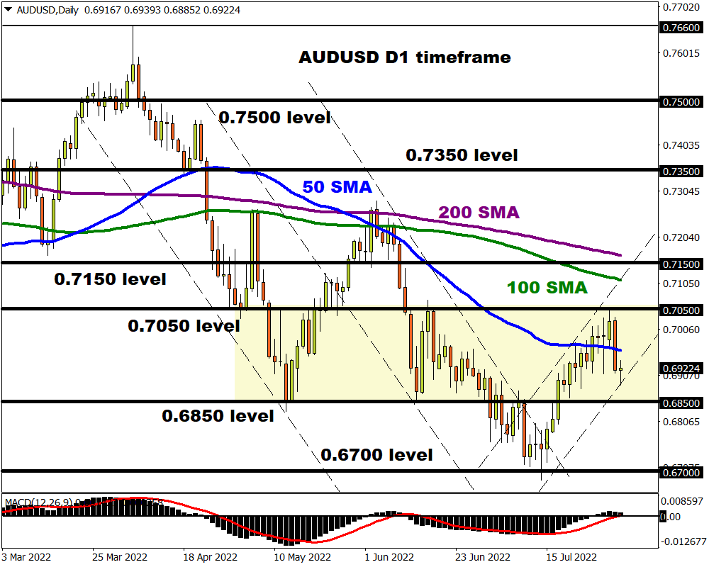 It's the same old story for the AUDUSD as prices trade within a very wide range. After yesterday’s steep selloff, prices are back under the 50-day Simple Moving Average. A decline back towards 0.6850 could be on the cards.