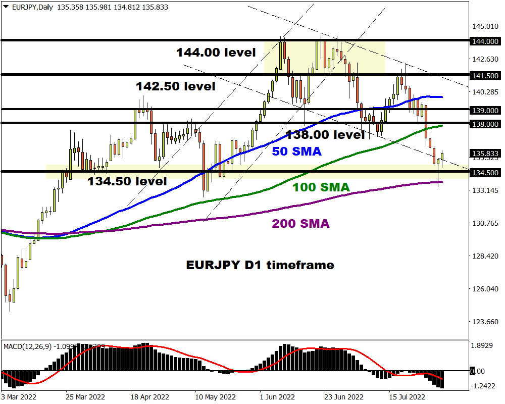 After rebounding from the 200-day Simple Moving Average, is the EURJPY primed for a major rebound? The trend remains bearish and prices are trading below the 50 and 100-day Simple Moving Average. Even the MACD is trading below zero, reinforcing the bearish bias on the EURJPY. Prices have the potential to bounce from the 134.50 region towards 138.00 which is below the 100-day SMA. Beyond this point, bulls may target 139.00 and 141.50.