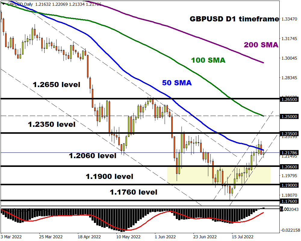 Where the GBPUSD concludes this week may be heavily influenced by the BoE rate decision on Thursday. Key levels of interest can be found at 1.2060 and 1.2350. A move back above the 50-day Simple Moving Average may encourage an incline back towards 1.2350.