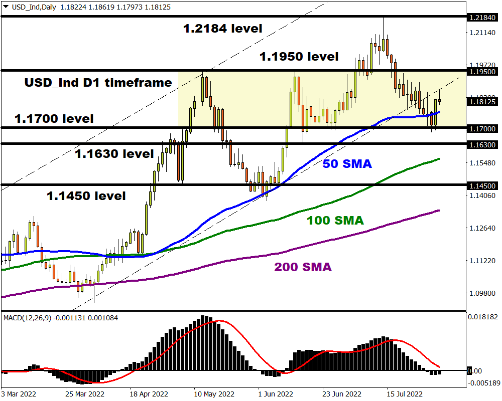After rebounding from the 1.1700 level, the equally weighted USD Index has found itself back within a wide range. The upside momentum may take prices back towards 1.1950. Beyond this level, bulls could challenge 1.21840.