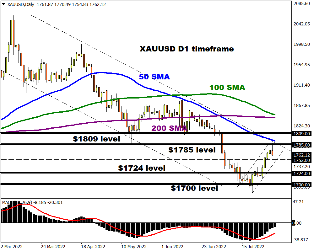 Gold is trading below the 50, 100, and 200-day Simple Moving Average while the MACD is trading below zero. However, prices are respecting a minor bullish channel with resistance at $1785. A strong break above this level could encourage a move towards $1809 and beyond. If the precious metal breaks under $1752, a decline towards $1724 and $1700 could be on the table.