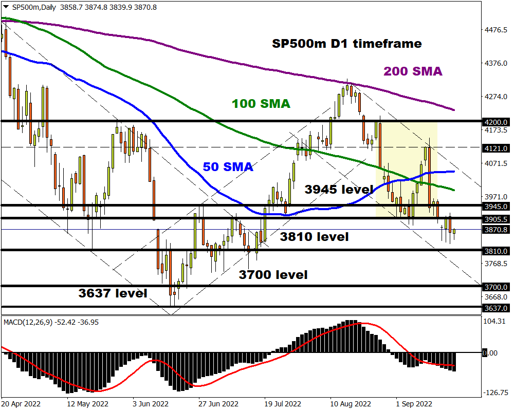 Appetite for riskier assets has been hit by mounting geopolitical tensions. This may translate to more losses on the S&P 500 which remains bearish on the daily charts. A strong move below 3810 could result in a selloff towards 3700 and 3636. If bulls can push prices back above 3905, expect a potential incline towards 3945 and the 100-day SMA at 4000.